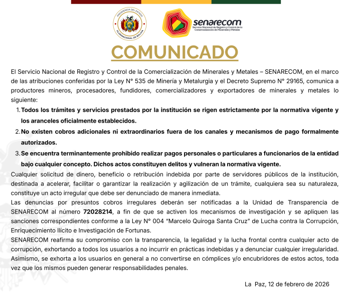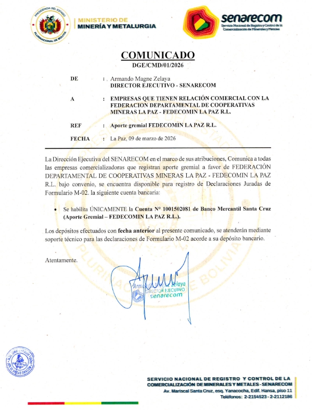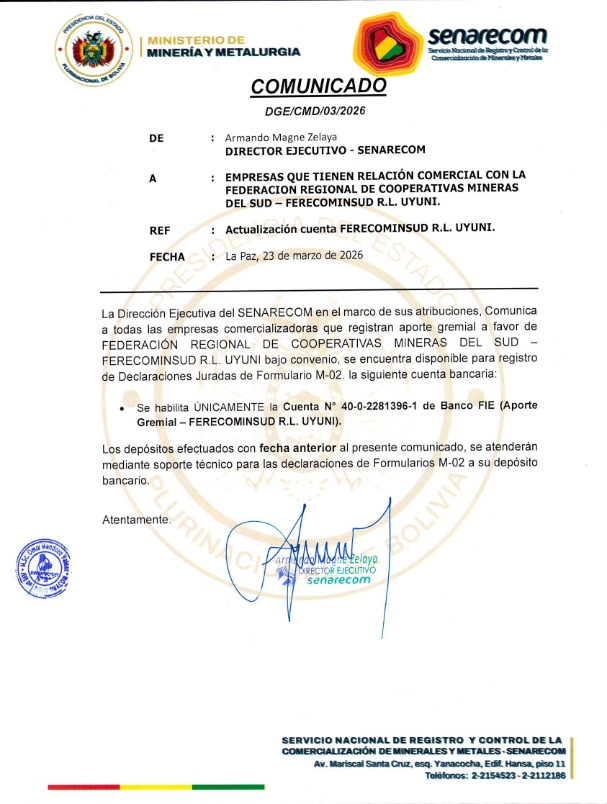 COMUNICADO DGE/CMD/08/2022 DEL 03/04/2023 Retencion de aporte y cualquier pago por concepto decompra - venta de minerales de la "Cooperativa Minera Reserva Fiscal R.