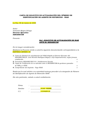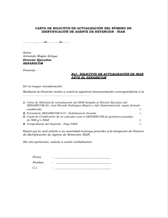 1. Carta de Solicitud de actualización del NIAR dirigida al Director Ejecutivo del SENARECOM (Sr. Armando Magne Zelaya) o Jefe Departamental, según formato establecido.