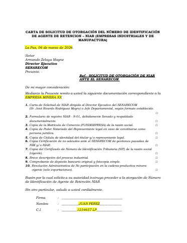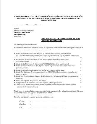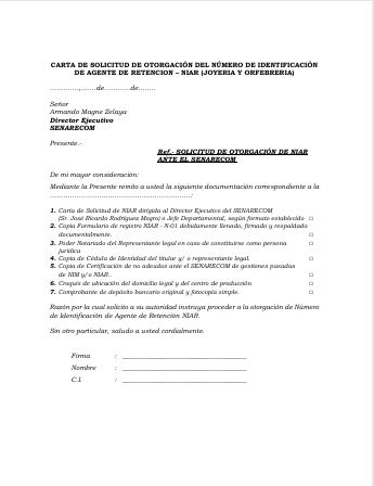 1. Carta de Solicitud de NIAR dirigida al Director Ejecutivo del SENARECOM (Sr. Armando Magne Zelaya) o Jefe Departamental, según formato establecido.