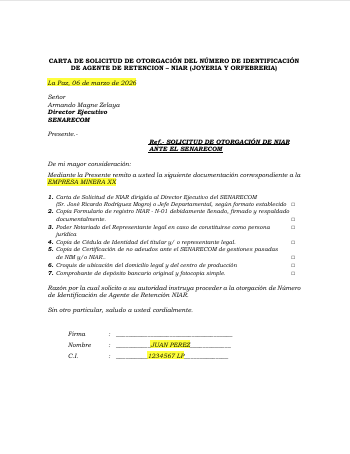 En el marco del Plan de Desburocratización el Servicio Nacional de Control y Comercializacion de Minerales y Metales SENARECOM, ha emitido la Resolución Directorio Nº 002/2016 de fecha 10 de mayo de 2016 y Resolucion Directorio Nº 007/2016 de fecha 11 de agosto de 2016, el cual determina en el reglamento y procedimiento especifico, cuanto a la otorgación del Número de Identificación Agente de Retención N.I.A.R., dar cumplimiento a los siguientes requisitos: